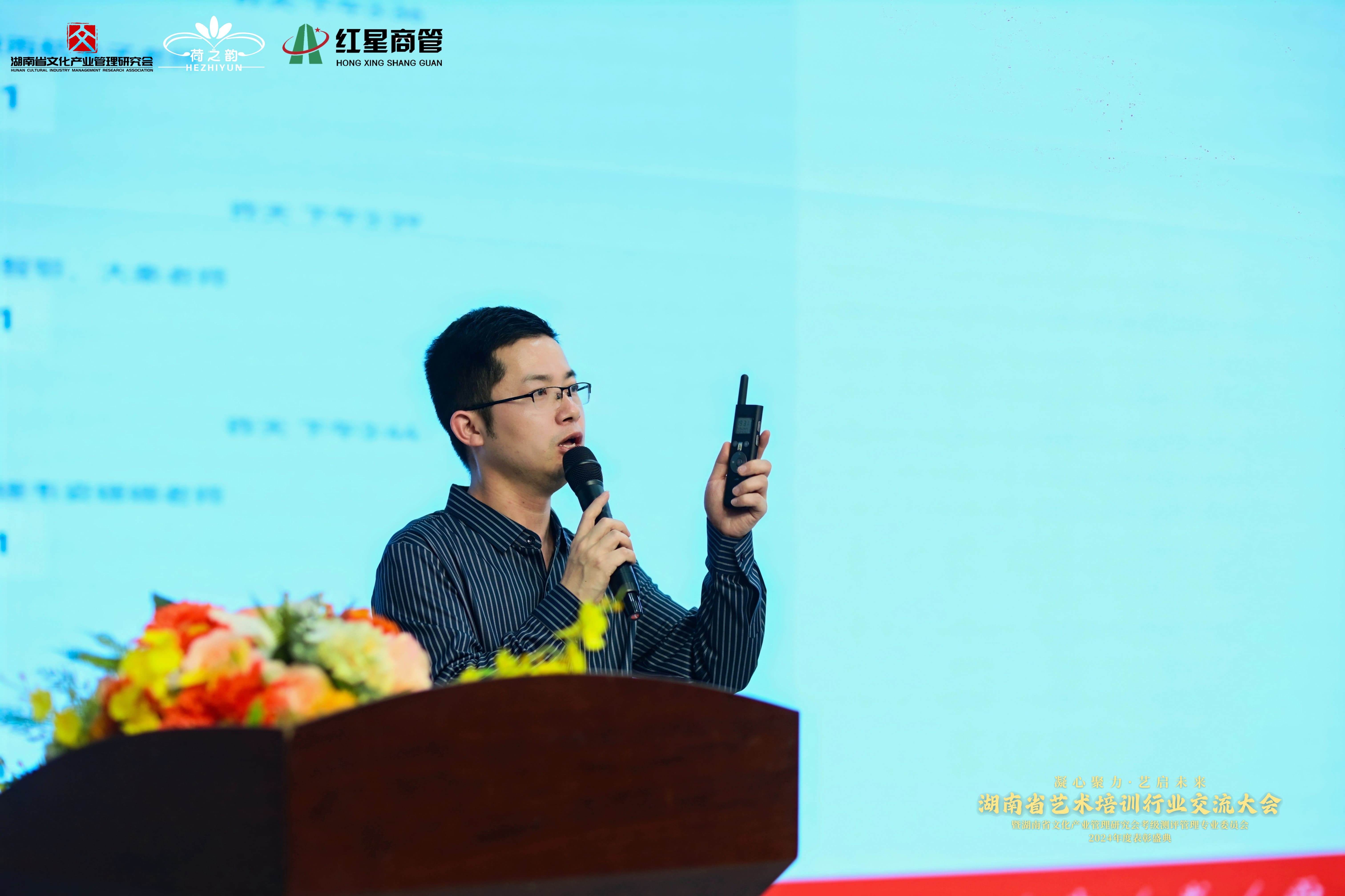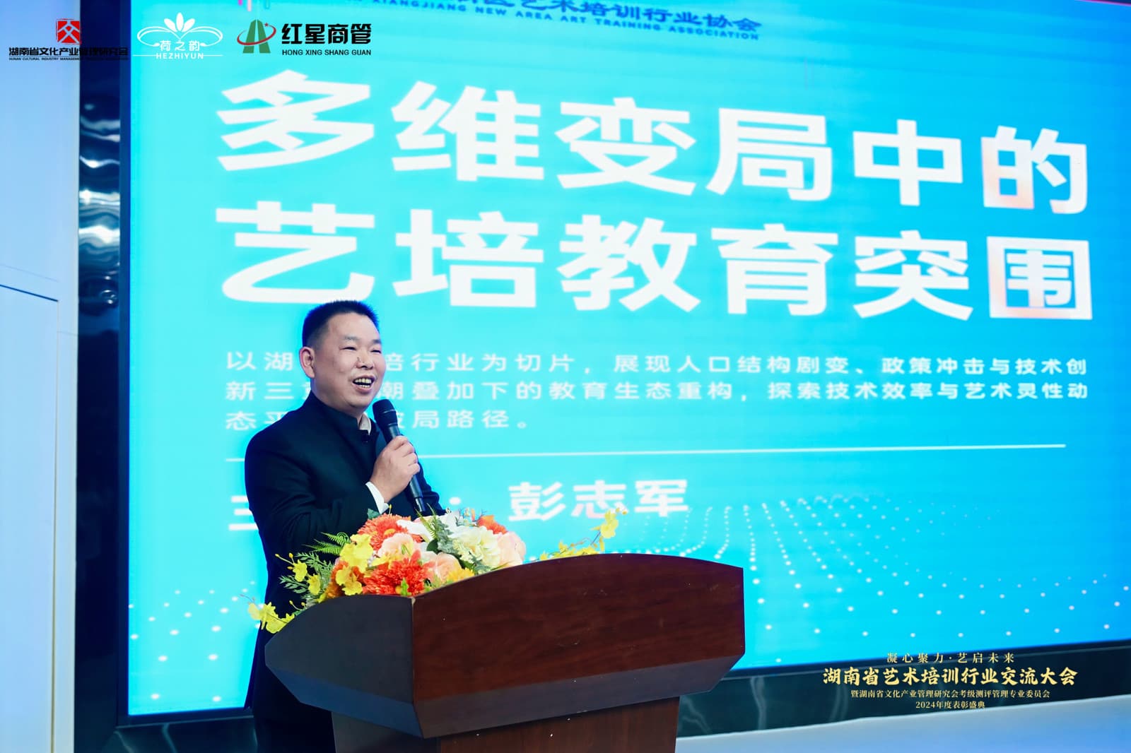 湖南省文化产业管理研究会副会长彭志军先生以《多维变局中,艺术培训如何突围》为题,结合行业现状,分析挑战与机遇,提出机构需通过差异化课程与数字化转型实现突破。